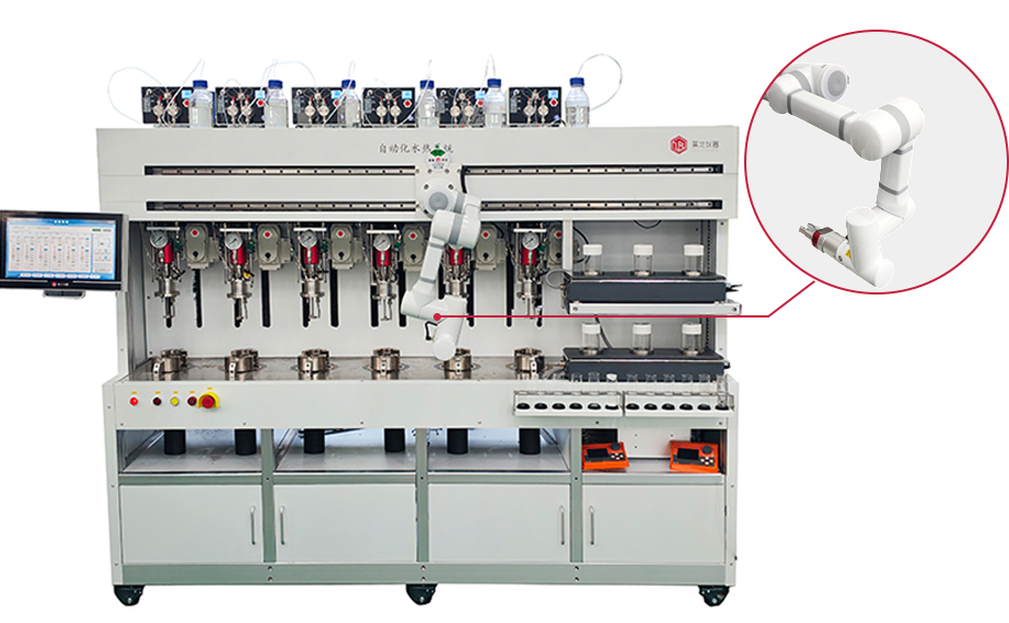 全自動智能高壓反應系統 配備多軸機械臂,可精準實現自動進料、自動取料、自動傾倒,反應釜可實現自動開合、自動升降、自動密封。整套裝置全自動運行,無人化操作
